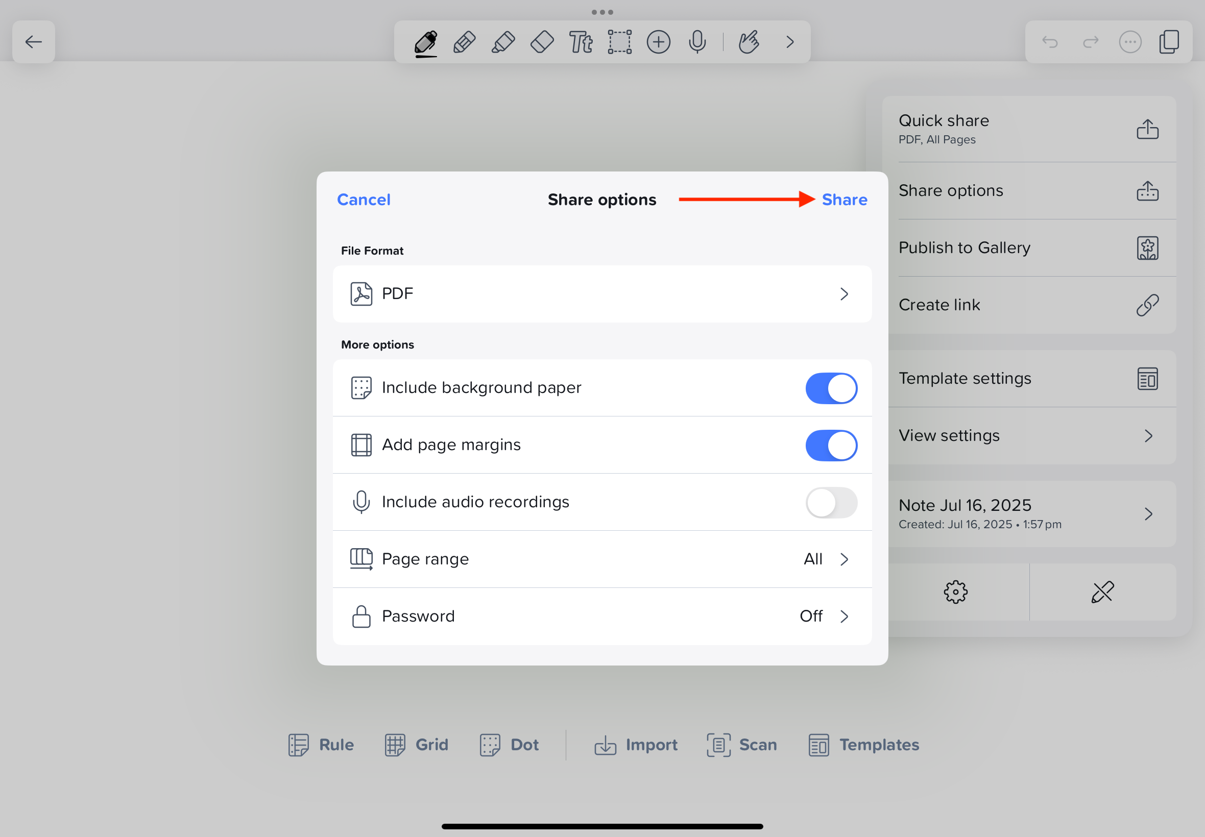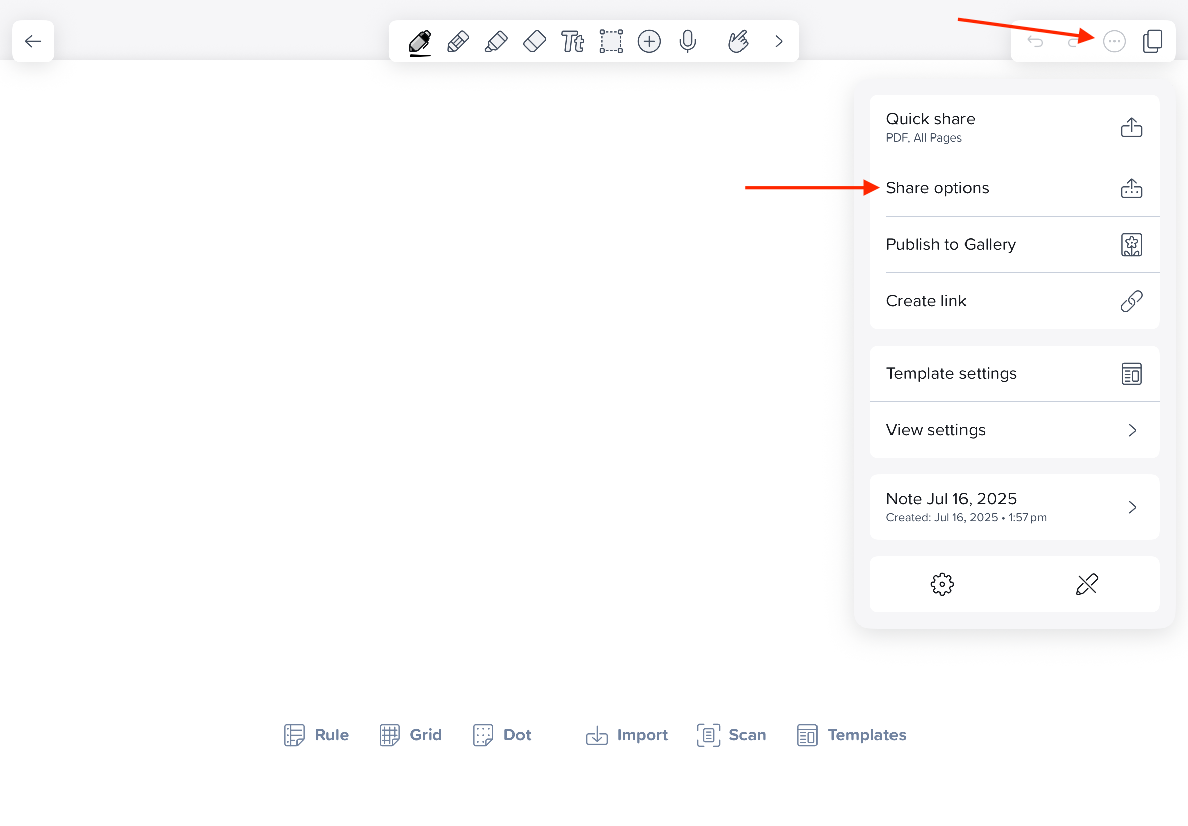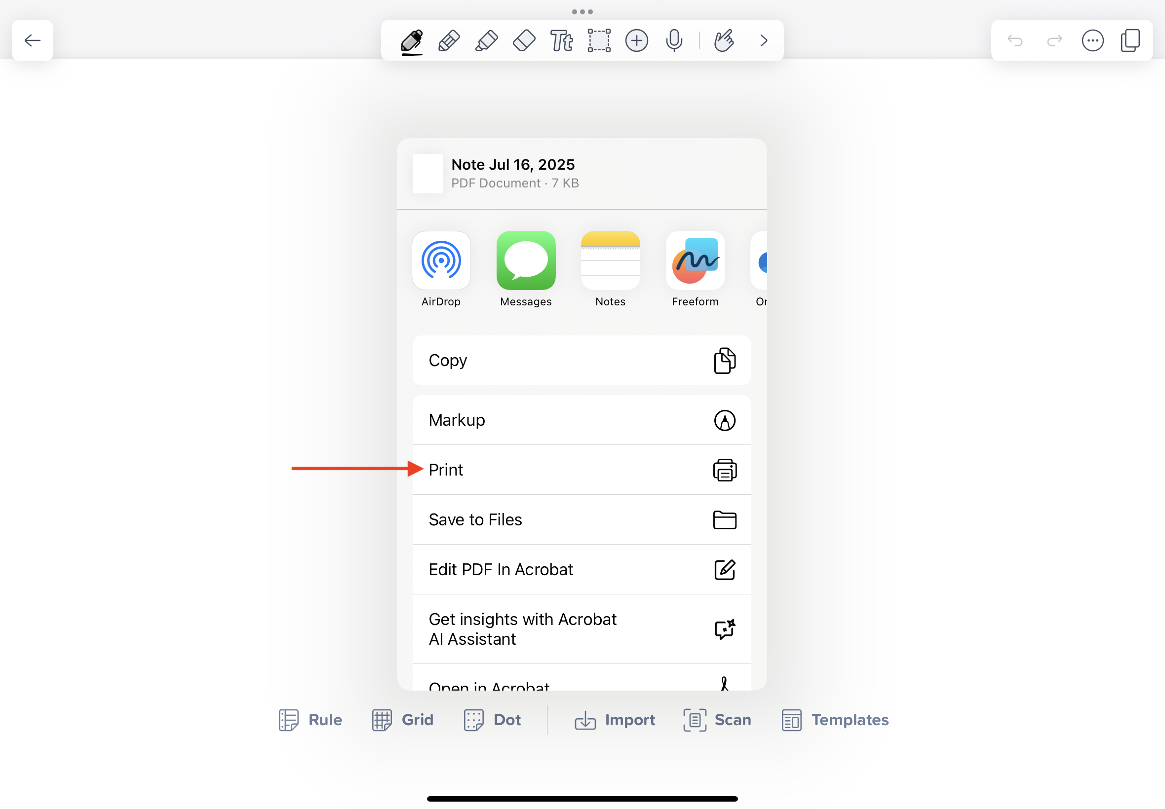 Open the note you want to print, and tap the 3 dot menu in the top right and tap Share options