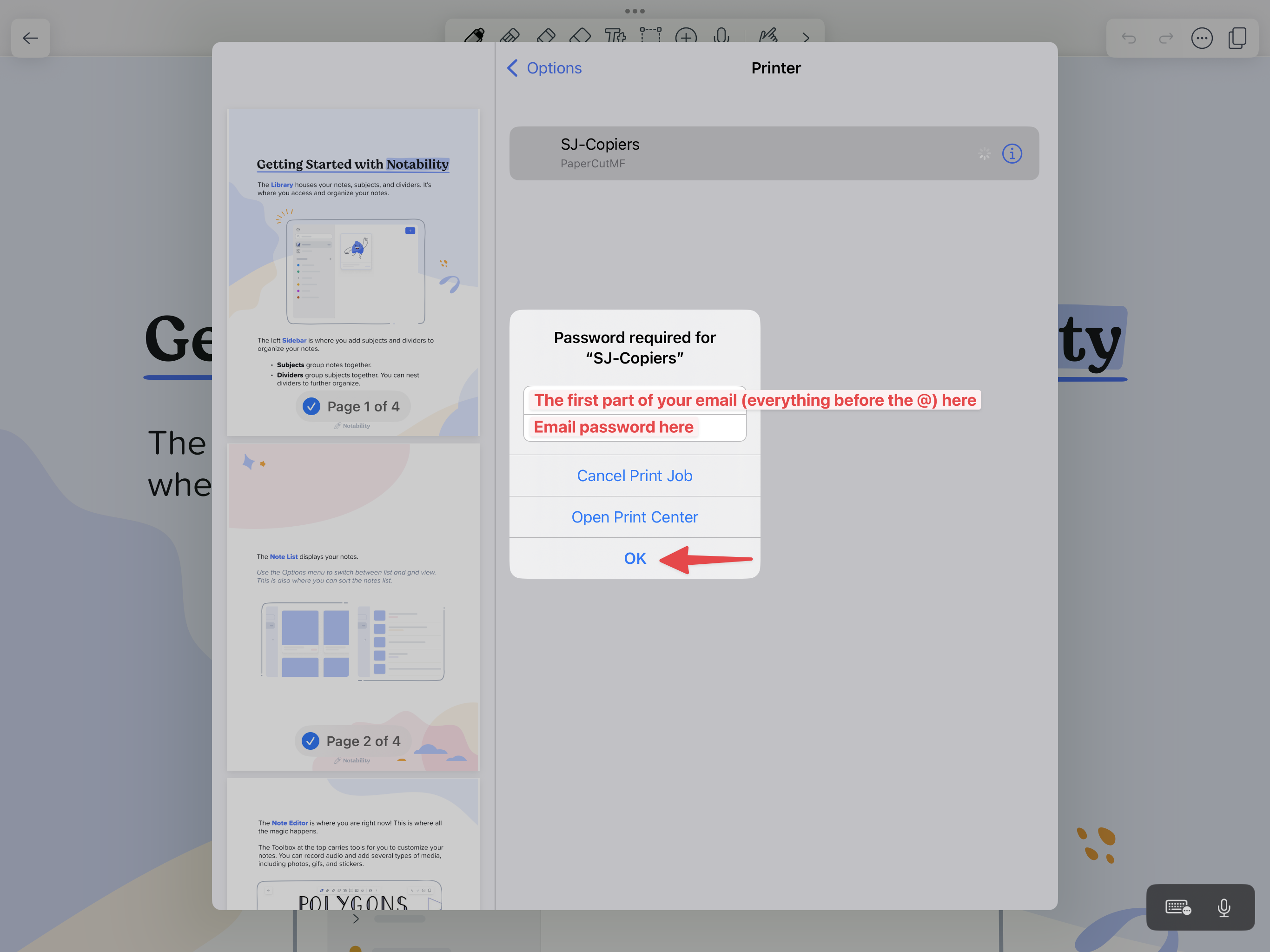 On the login window that pops up, you'll need to enter the first part of your email for the username, and your email password as the password. Tap OK and your print job will be sent